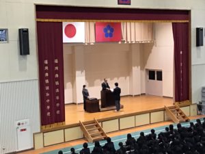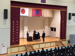 本日、12月の全校集会を行いました。本校は前期・後期の二学期制を採用していますので、引き続き、後期は継続となりますが、本日が今年最後の授業日となりました。校長先生の講話の後、総合運動部、剣道部、柔道部、華道部などの表彰が行われました。今年も学習や部活動や学校行事などに全力で取り組んだ一年間でした。