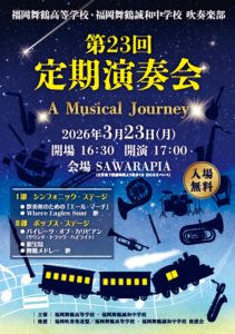 本校吹奏楽部の「第23回定期演奏会」を令和8年3月23日(月)に開催させていただきます。皆さまのご来場をお待ちしております。