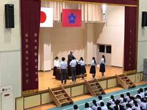 夏休みが終わり、本日より授業再開となりました。本校は前期・後期の2学期制を採用しているため、9月末までが前期の授業期間となります。1時間目に全校集会を行い、校長先生のお話の後、部活動関係の表彰などが行われました。総合運動部(エアロビクス/水泳/ボウリング)、放送部、情報技術部、剣道部、柔道部など。本校は部活動参加率が高く、全校生徒の約8割が部活動に所属していますが、全国、九州を舞台に活躍している部活動も多く、舞鶴流文武両道を実践しています。