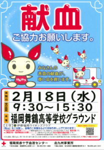 毎年恒例となっております伊都福岡ライオンズクラブ主催の「献血運動」が、2月18日(水)の9:30~15:30、本校第1グラウンドにて行われます。近隣にお住まいの皆さまや職場がお近くの方々は、是非、献血にご協力ください。どうぞよろしくお願いいたします。